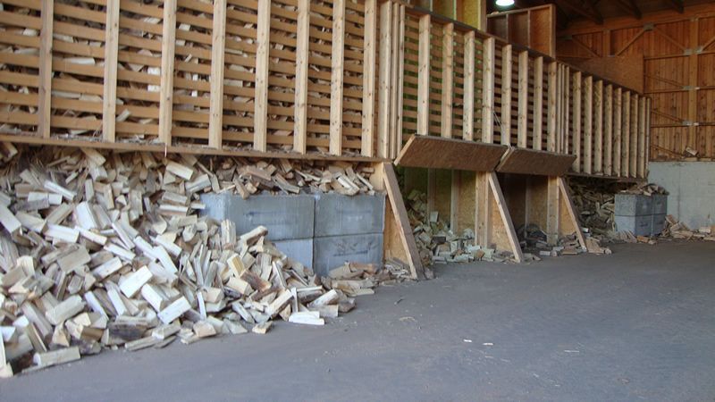 Nach der Fertigung wird das Brennholz in Containern verladen und mit der Hilfe einer Biogas-Anlage ca. 9 - 13 Tagen kammergetrocknet.